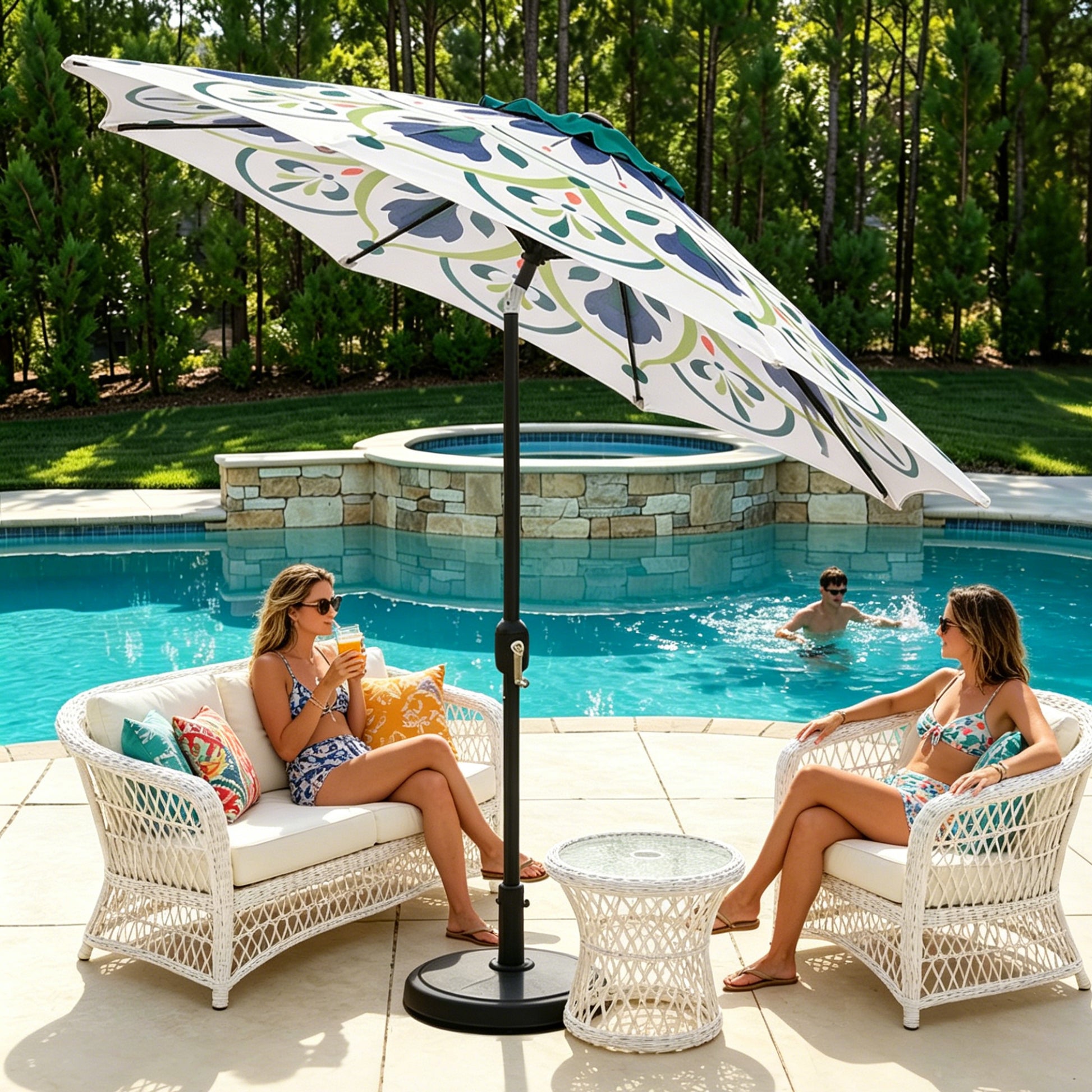 Elevate your outdoor space with a statement piece that blends style and function. This 9 ft diameter market umbrella features a stunning, modern botanical pattern in calming blues and greens—perfect for patios, decks, gardens, or poolside lounging.
